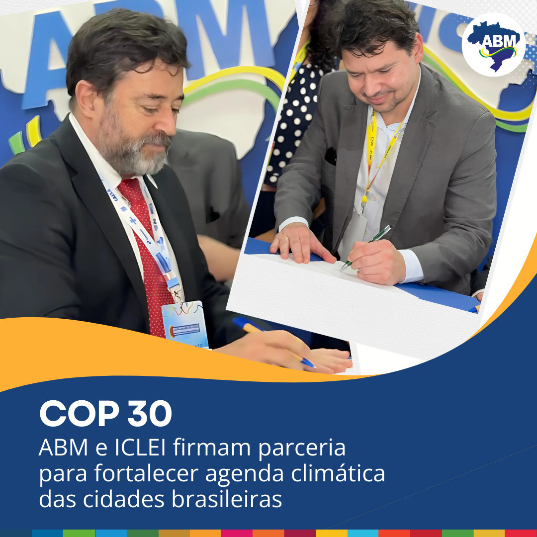 No dia 12 de fevereiro, durante o Encontro de Novos Prefeitos e Prefeitas, o diretor executivo da Associação Brasileira de Municípios (ABM), Eduardo Tadeu, e o secretário executivo do ICLEI América Latina, Rodrigo Perpétuo, assinaram um memorando de entendimento que estabelece uma cooperação mútua para apoiar os eventos realizados pelas duas instituições, com foco especial na COP30, conferência global sobre mudanças climáticas que será realizada no Brasil em 2025, em Belém/PA. A cerimônia de assinatura ocorreu no estande da ABM, marcando um passo importante no fortalecimento da agenda climática das cidades brasileiras.