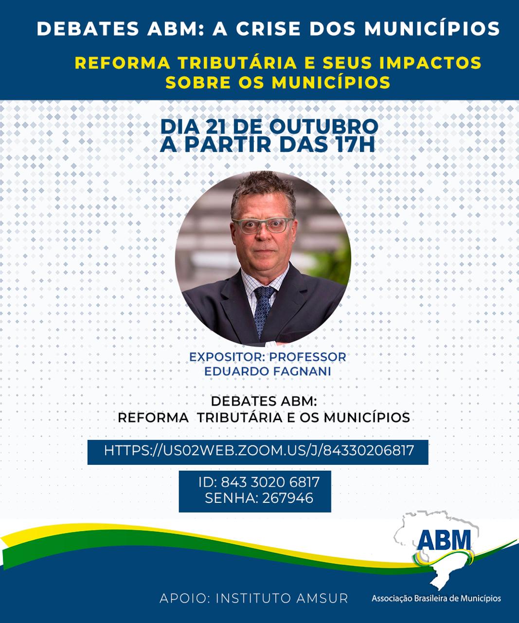 A Associação Brasileira de Municípios (ABM) realizará no dia 21 de outubro, às 17h, o evento online Debates ABM: a crise dos municípios, cujo tema será “Reforma Tributária e seus impactos sobre os municípios brasileiros”. A exposição será feita pelo professor Dr. Eduardo Fagnani, da Universidade Estadual de Campinas (UNICAMP).