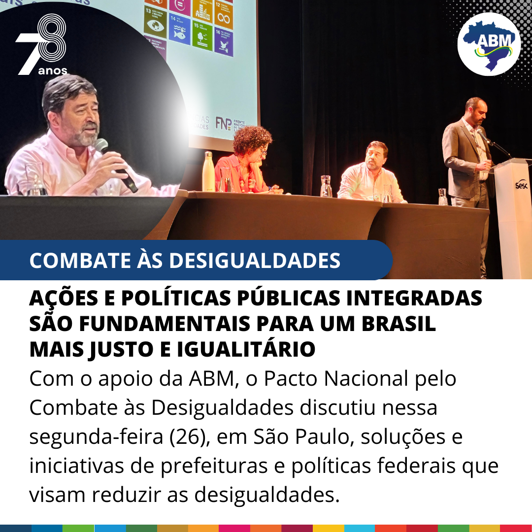 Com o apoio da ABM, a atividade reuniu especialistas, autoridades e representantes da sociedade civil para discutir soluções e apresentar iniciativas de prefeituras e políticas federais que visam reduzir as desigualdades nos territórios brasileiros. “As desigualdades são mais sentidas pela população nos territórios”, afirma o diretor executivo da ABM, Eduardo Tadeu. “Por isso, é fundamental que os governos locais assumam a responsabilidade de implementar ações e políticas públicas integradas, sustentáveis e inclusivas.”