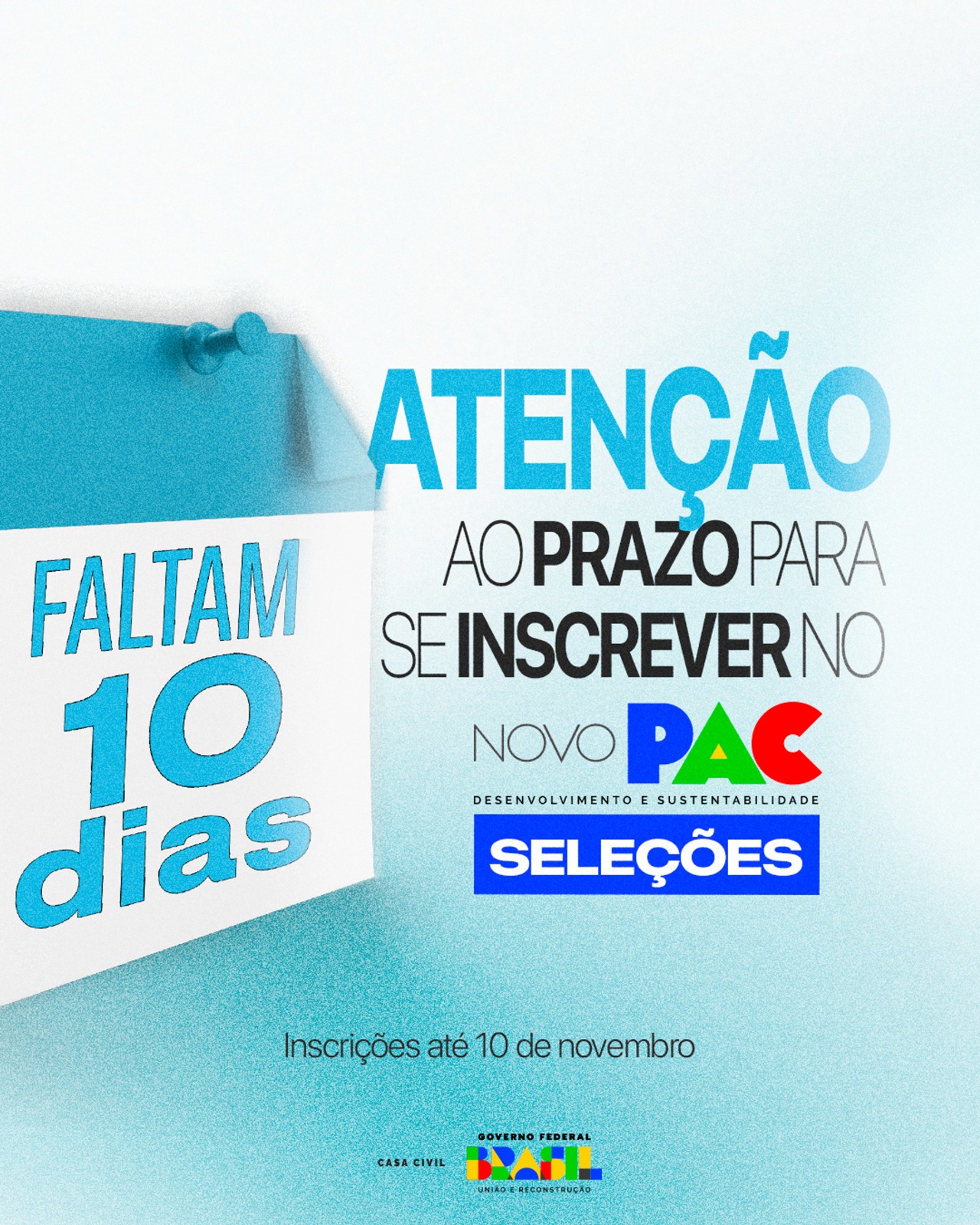 O Novo PAC Seleções é uma oportunidade de apresentar diretamente aos Ministérios quais são as principais necessidades e prioridades para a população da sua cidade.