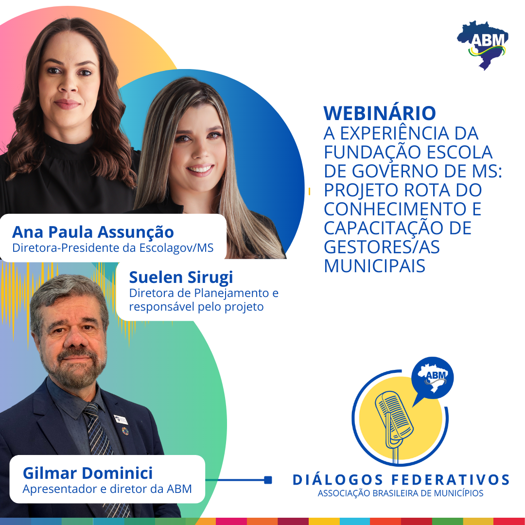 A Associação Brasileira de Municípios (ABM) realiza, na próxima terça-feira (26), às 15h, mais uma edição de seu podcast “Diálogos Federativos”. No formato de webinário ao vivo, o programa mergulhará em um case de sucesso na área de capacitação de gestores públicos: a experiência da Fundação Escola de Governo de Mato Grosso do Sul (Escolagov/MS).
